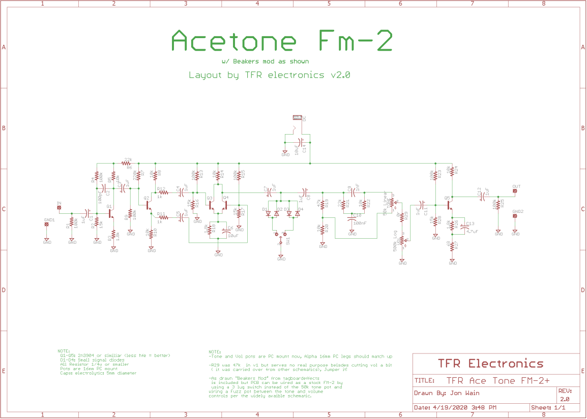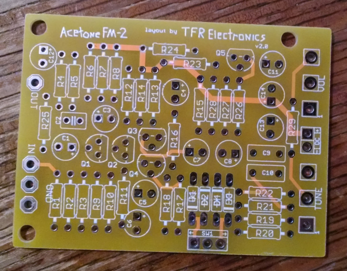The Ace Tone FM-2 is a really cool and rare fuzz pedal made in the late 1960s by Ace Tone in Japan. It’s fairly similar in design to the standard superfuzz circuit but has a more spastic and raw sound. I designed this PCB a few years ago, and did a short run of each of two revisions. My layout follows the schematic widely available online, with the added options for two simple changes that I think really expand the pedal’s sound. The board can be wired as the original with a tone switch but is laid out for a PCB mount pot tone which allows for a wider range of tones. It also has the option for a switch to select between no clipping diodes and 2 different pairs of clipping diodes. I personally really like the pedal without clipping diodes for the extra volume and different tone.
