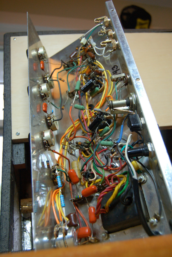 All of the 1/4” jacks needed to be replaced so I decided to rework the instrument inputs to a Fender Hi/Lo style. I also modified the preamp for a little more gain and brightness in that section since these amps tend to sound dark. I left the Mic input and preamp section stock for whenever I want that sound.